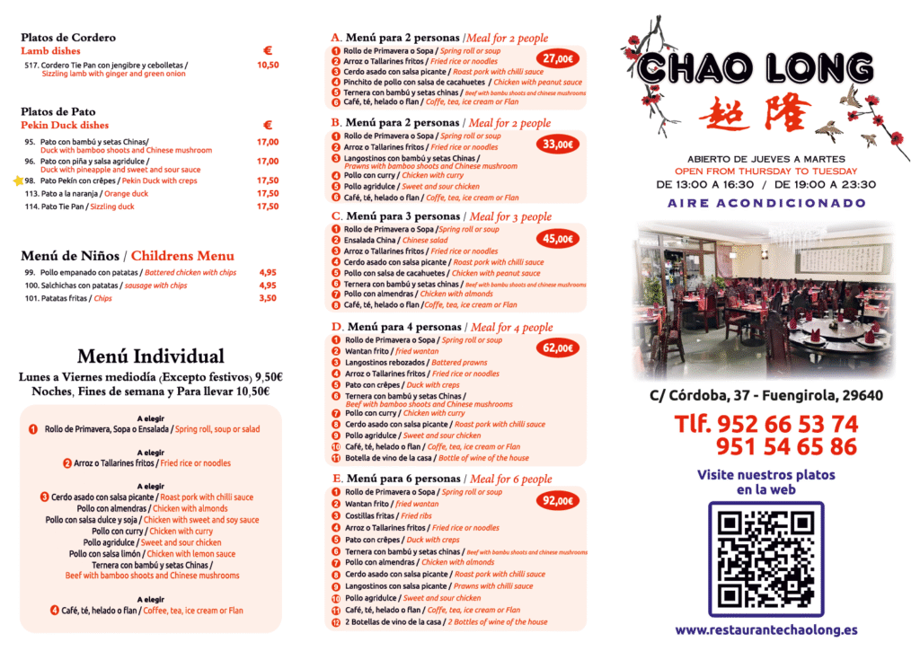 RESTAURANTE CHAO LONG Nuestra Carta Ver Carta Pide para llevar Puede hacer su pedido y recogerlo en el local. No disponemos de servicio de reparto a domicilio. Contacto 952665374 Horario de Apertura LUNES : 13:00 – 16:30 Y 19:00-23:30MARTES :13:00 – 16:30 Y 19:00-23:00MIERCOLES : CERRADOJUEVES : 13:00 – 16:30 Y 19:00-23:30VIERNES : 13:00 – 16:30 Y 19:00-23:30SABADO : 13:00 – 16:30 Y 19:00-23:30DOMINGO : 13:00 – 16:30 Y 19:00-23:30 NUESTROS PLATOS ESTRELLA Cerdo Asado Picante 7,25€ Pollo al Limon 6,50€ Pato Pekin con Creps 17,50€ Arroz Mixto6,75€ Rollo de Primavera2,35€